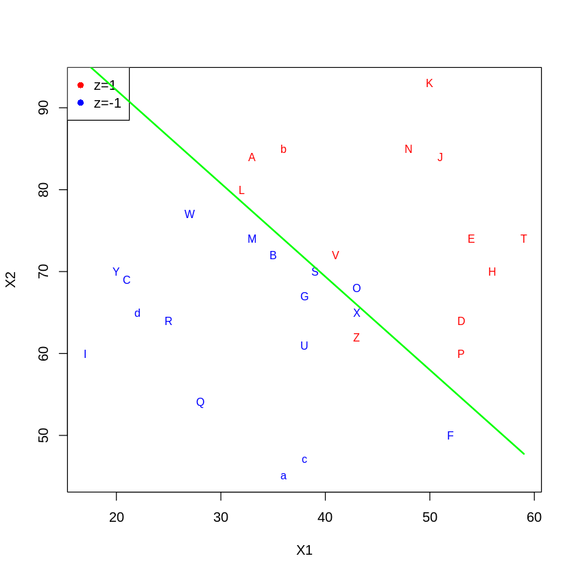 lines(c(x1min,x1max),c(x2min,x2max), type="l", col="green", lwd=2)