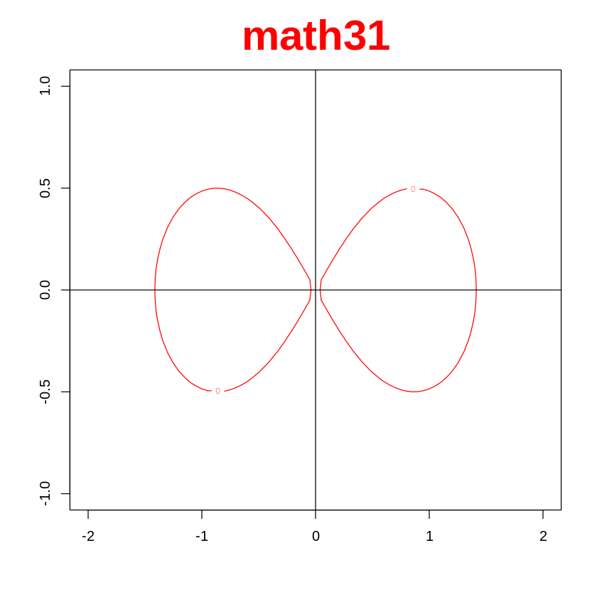 f(x,y) = x^2+y^2+1)^2-4*x^2-1 = 0 のグラフ outer(x, y, fxy) x と y の外積(すべての点)でのfxyの計算値 巨大な行列になる contour(x, y, z, levels=0, asp=1) z=levers となる座標(x,y)を表示する levels=0 なら f(x,y)=0 の解となる