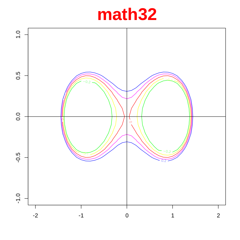 math31 では、f(x,y)=0 のグラフでしたが、f(x,y)=-0,2, -0.1, 0, 0.1, 0.2 の等高線グラフにしました。