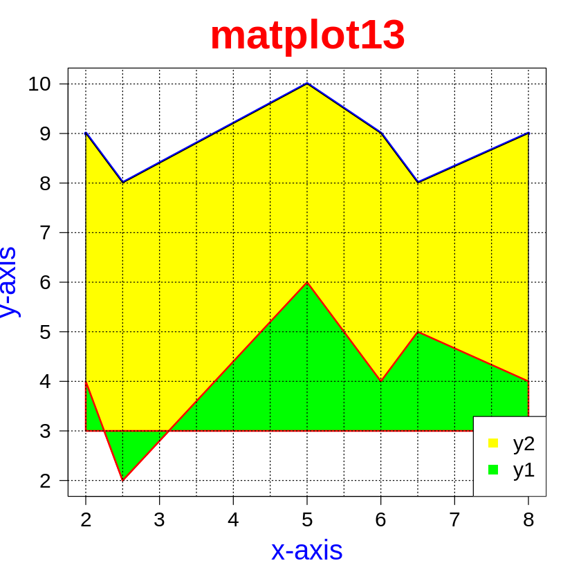 math12 に y2=x*x のグラフを重ねます。 前のグラフに重ねるので、次のグラフ作成の前に par(new=T) を記述します。 グラフの大きさを同一にするために、次のグラフの xlim と ylim は前のグラフと同一にします。 各種体裁は前のグラフが記述しているので、次のグラフでは重複しないようにします。