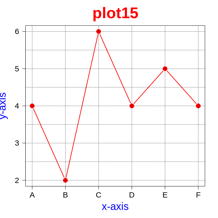 折線グラフは、散布図に type="b" を付加して、必要に応じて線に関するオプションを設定するだけです。散布図の部分を参照してください。