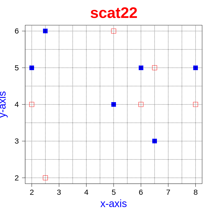 pch=c(0,15), col=c("red","blue"), # 点の形状と色:個別に与えた