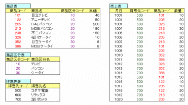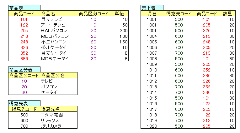 「売上.xls」の「売上(第1正規形)」には,ここで扱うすべてのデータを一つの表にしたもの(下左図に相当),「売上(第3正規形)」には,それを第3正規化した4つの表が入っています(下右図に相当)。これらは印刷しておき,いつでも参照できるようにしておきましょう。