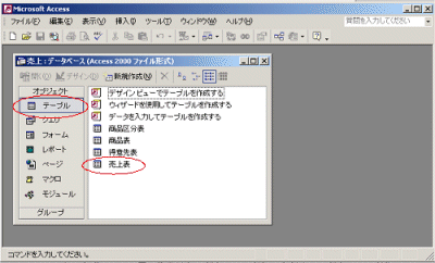 - 「売上.mdb」をダブルクリックすると,次の画面になります(もし,異なる画面が出ていたら,画面の左側の「テーブル」をクリックしてください)。「売上(第3正規形)」の4個の表が,それぞれRDBのテーブル(表)となっていることがわかります。