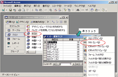- 次に,その表のタイトル部分(青い部分)を右クリックするとプルダウンメニューが表示されますので,「SQLビュー」を指定すると,この処理をした「テスト」のSQLが表示されます。これは,この画面で任意に加工することができます。実際にはこの画面で直接に直すのは文字のフォントが見にくいので,あらかじめテキストファイルにSQLを作成しておき,それを貼り付けるほうが便利です。