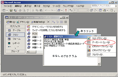 - また,そのタイトル部分を右クリックすると,プルダウンメニューが表示されます。ここで「データシートビュー」を指定すると,結果の表が表示されます。このように「SQLビュー」と「データシートビュー」を繰り返すことにより,求めるSQLやその結果の表を得ることができます。