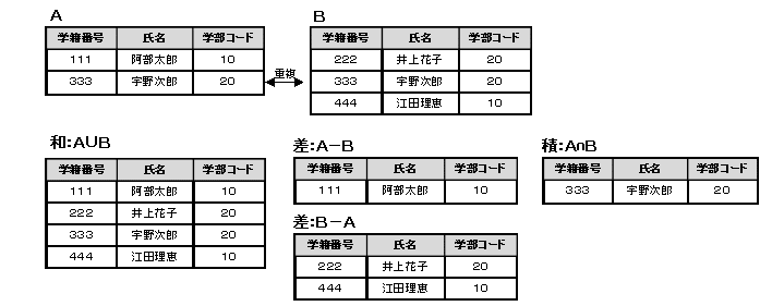 「共通」「交わり」ともいいます。A、Bの両方にある行を取り出します。