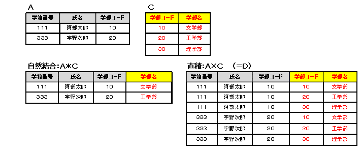 「交差結合」「デカルト積」ともいいます。Aの各行とCの各行を組み合わせた表になります。