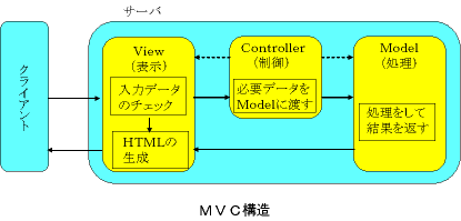 上述のように、HTMLクライアントの環境では、クライアントよりもサーバに関する事項が重要です。それには、サーバをMVC構成にするのが適しています。MVCとは,Model(処理),View(表示),Controller(制御,入力)のことです。