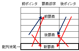 | 要素 | 配列 | 前ポインタ | 後ポインタ |