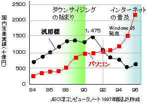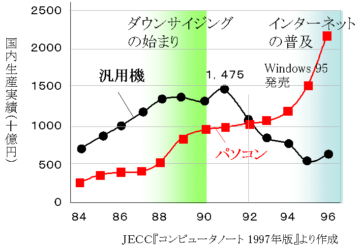 オープン化が進むと,パソコンの機能や性能はどのメーカーでも似たようなものになりますので,他社との差別化のために価格競争が激化します。その結果,パソコンやワークステーションの価格は急激に低下しました。1980年代末には,その価格性能比が汎用コンピュータのそれとは比較にならないまでになりました。