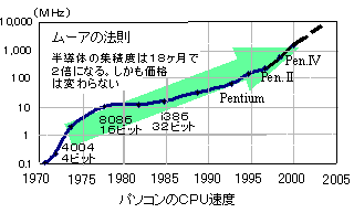 その後,コンピュータの性能は急激に向上しました。1秒間に1百万回の命令を処理する速度を1MIPSといいますが,その速度は十数年間の間に百倍にもなりました。また,需要の拡大や技術の進歩により素子の価格は急速に低下しました。その結果,価格性能比は十数年間で1万倍にもなったのです。