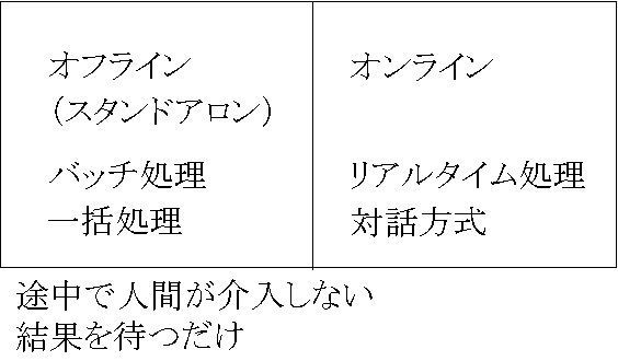 現在のコンピュータ(サーバ)はパソコンと接続しており(この状況をオンラインといいます),パソコンから指示(命令やデータ)を与えると即座に結果が表示され,それを見て次の指示をするというように人間とコンピュータが対話方式により処理を進めていますが,その頃は,コンピュータは通信回線で接続していませんでした。そのような状態をオフラインとかスタンドアロンといいます。当時はコンピュータ(電子計算機:電算と略していた)を使用するには,次のような面倒がありました。 ☆