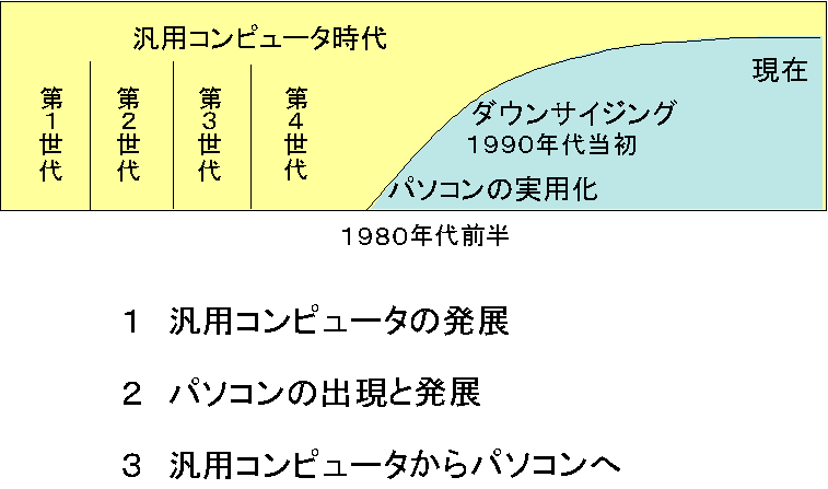 私たちは,コンピュータというとパソコンのことと思いがちですが,企業ではそれまでに汎用コンピュータが主流の時代があったのです。その汎用コンピュータの発展の歴史を理解すること,1980年代からパソコンが普及発展した経緯を理解すること,そして,1980年代末から1990年代にかけて,汎用コンピュータによる集中処理からパソコンによる分散処理に移行した事情を理解します