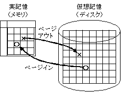 そして,実行に必要なページがメモリに存在しない(ページフォルトという)ときは、そのページを仮想記憶から実記憶に取り込みます。これをページイン(スワップイン、ロールイン)といいます。CPUでの処理が進むにつれて,いろいろなプログラム,あるいは一つのプログラムでのいくつものページが実記憶にページインされます。その結果,実記憶が一杯になると(実際にはある制限値を超えると),不要になった実記憶のページを仮想記憶へ移して空きページを作ります。これをページアウト(スワップアウト、ロールアウト)といいます。ページインとページアウトを総称してページングあるいはスワッピングといいます。