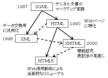 - 一時,HTMLは4.01版で固定し,今後の発展はXHTMLに移行しようという動きがありました。ところが、XHTMLへの移行はあまり進まず、その間に、Webによるビジネスが発展して、HTMLでWebアプリケーションを記述する必要性が多くなり、HTMLの新バージョンであるHTML5が策定されました。