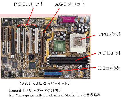 いろいろな部品が組み合わさっていますが,そのなかで最も中心になるのが,上右図のマザーボードです。わかりにくいので,イラストで示しましょう