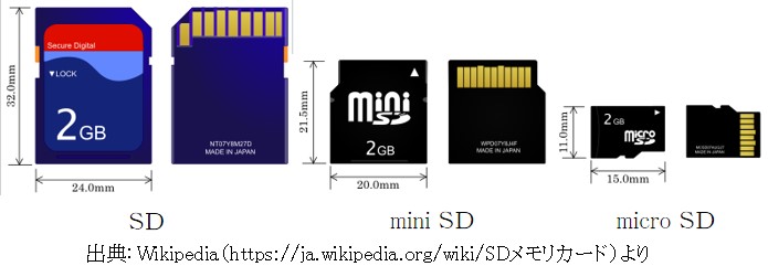 標準のSDメモリカードは、32mm×24mm、厚さ2.1mmですが、小型化した規格に miniSDメモリカード、microSDメモリカードがあります。