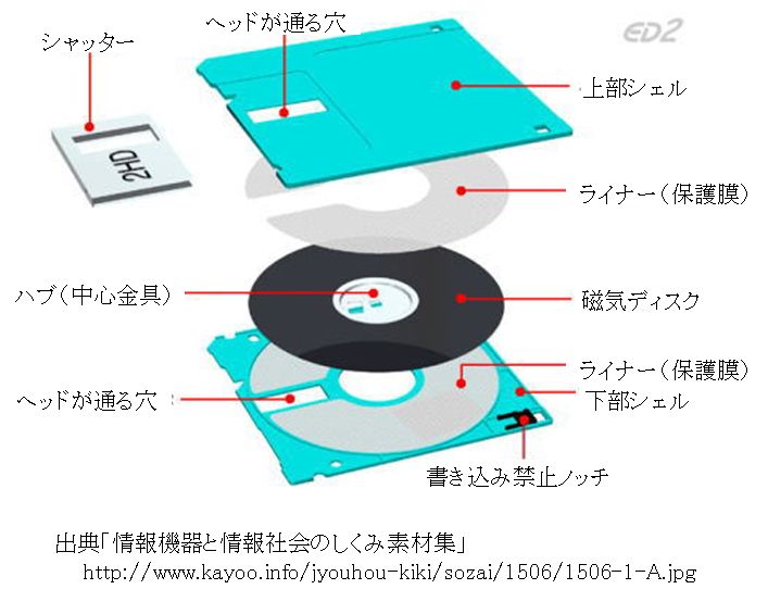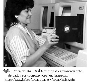 最近のパソコンではフロッピー装置がついていないし、フロッピーの製造も打ち切られるようになりました。それで、若い人は、見たことがないかもしれません。下左図のようなものです。現在では、持ち運びができる記憶媒体としてCD-RやUSBメモリが用いられていますが、1990年代まではフロッピーが主流であった。1.44MBの小容量ですが100円以下の低価格だったので、他人にデータを渡すときにもよく使われていました。