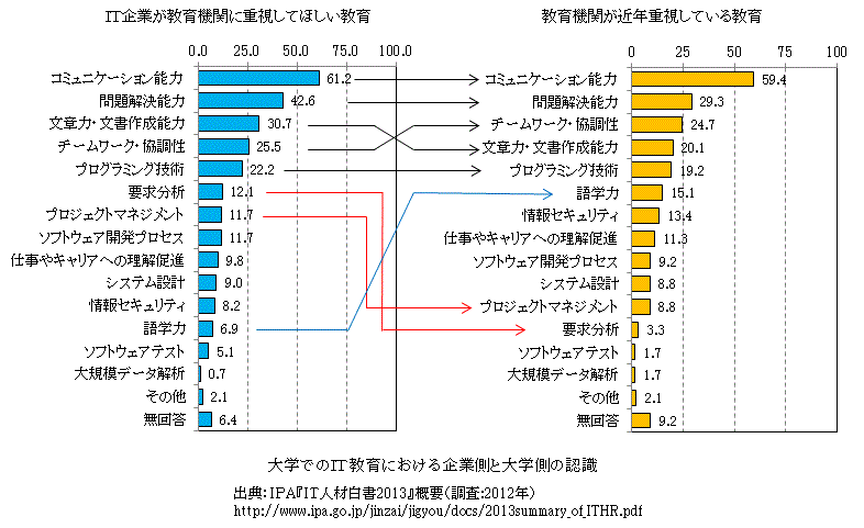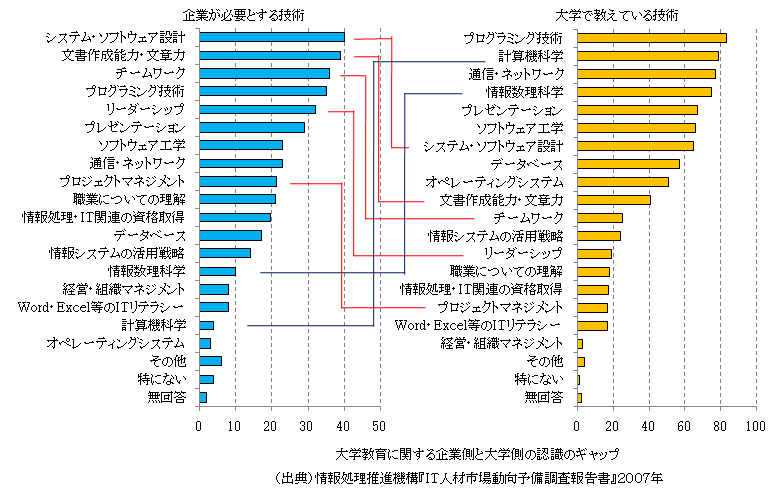 このような産業界のニーズに対して、大学のIT教育(情報学部の教育内容)がミスマッチになっていることが問題になっています。産業界で必要となる技術が大学ではあまり教えられず、大学で重点になっている授業科目が実務ではあまり役立たないと指摘されています。