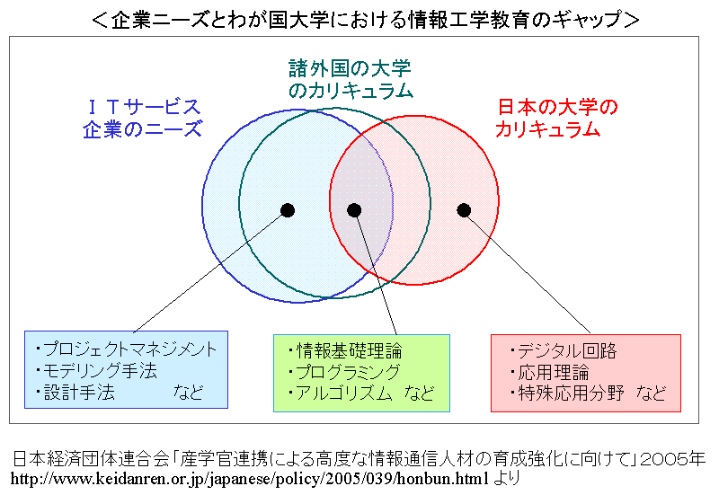 このような企業の要請と大学でのIT教育の間にミスマッチがあることが、以前から指摘されています。日本経済団体連合会は、「産学官連携による高度な情報通信人材の育成強化に向けて」2005年で、次のような指摘をしました。