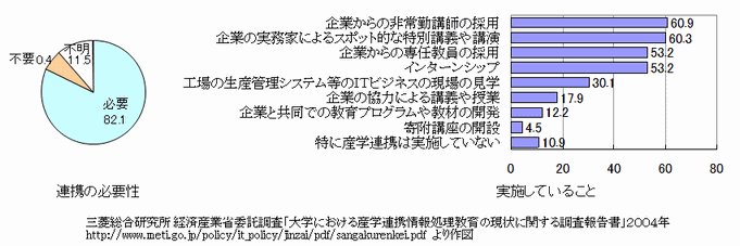 ミスマッチを解消するには、大学だけの努力ではなく、産学官の連携が必要です。経済産業省は 『大学における産学連携情報処理教育の現状に関する調査報告書』(2004年)において、産学官の連携の状況を調査し、連携推進の重要性を示しています。