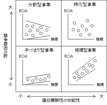 - 競争要因が少なく優位性構築の可能性が大きい事業です。競争手段が限られており、その分野に大きな経営資源をつぎ込めば、容易に競争優位に立てる事業です。すなわち、規模と収益性が比例する「規模型事業」だといえます。多数の製造業界がこれにあたります。