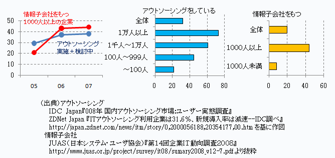 - 大企業では、システム開発やシステム運用などの業務を情報子会社やアウトソーシング先に委託しています(図表)(参照:「IT部門の戦略部門化とアウトソーシング」)。また、利用部門に所属してIT業務をしている人たちがいます。これらは統計上は計上されないでしょう。