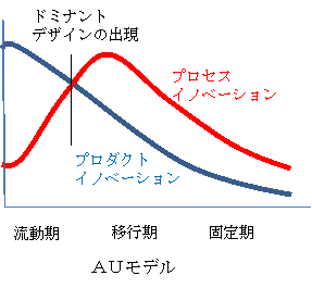 一つの産業分野の発展過程を、プロダクトイノベーションとプロセスイノベーションの発生頻度(生起率)によって特色づけ、流動的な段階からより固定的な段階へと変化し、それに伴い産業形態が変化していくとしました。