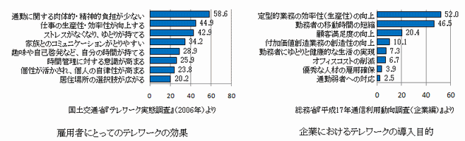 雇用者のテレワーク(雇用型テレワーク)と異なり、個人あるいは少人数の企業が、自宅あるいは小規模事務所に情報通信設備を置くことにより業務を行う形態(自営型テレワーク)です。