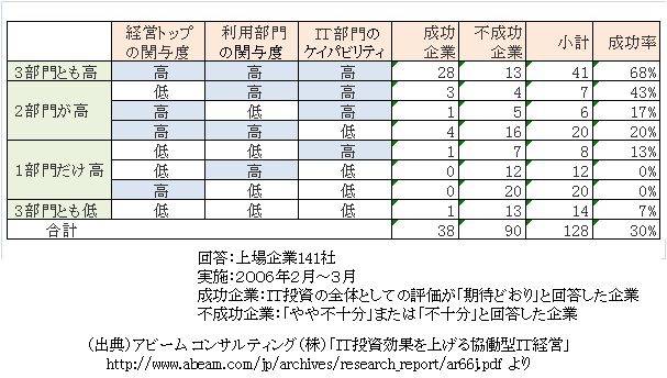 ITは経営や業務に深く関係しているため、IT推進をIT部門だけに任せることはできません。社内の多くの部門が関係します。IT投資の効果を上げるためには、IT部門の努力だけでなく、経営者や利用部門の積極的な関与が必要であり、その3者の協働が円滑な企業は、IT投資への満足度が高いのです(統計資料)。