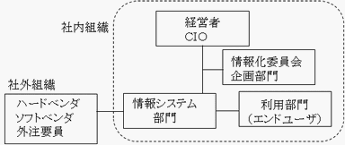 また、情報システムはますます大規模になり、情報技術は急激に発展します。それに対応するためには、自社要員だけでは不足で、社外の活用が必要になります。一般のIT推進組織は、図のようになっています。