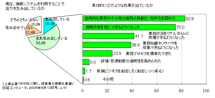 ところが、その効果は事務処理の効率化や情報の共有化など、どちらかといえば従来から取り組んできた分野であり、業務改革や新規ビジネスなどの戦略的な分野では、期待通りに十分な成果をあげている比率がまだ低い状態です。(図表)