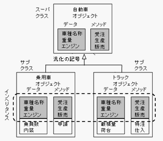 スーパークラスで定義されたデータ構造と手続をサブクラスで引き継いで使うことができます。それをインヘリタンス(inheritance;継承)といいます。例えば、自動車で定義したハンドルやタイヤなどの部品構成や、生産する、販売するなどの手続きについては、乗用車やトラックで再定義する必要はなく、乗車人数や積載重量などサブクラス特有のものだけを定義すればよいのです。新たにバスを追加するときは、バス特有の事項だけを検討すればよいのです。すなわち、継承という概念によって,モデルの拡張や変更の際に変更部分を局所化できます。