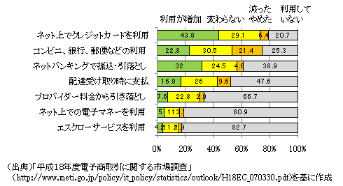 BtoCでは、代金の支払いをどのような手段で行なうかが重要な課題になります。主な支払手段には次の種類があります(支払手段の利用度)。
