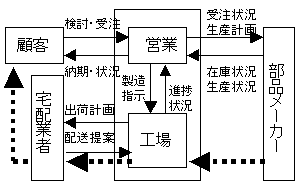 - 受注したデータは、自社の生産部門だけでなく、部品メーカーや流通業者へ即時に伝達します。部品メーカーや流通業者は、その情報によりスケジュールをたてることができます。