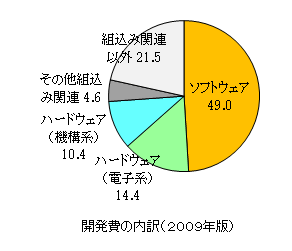 組込み関連産業生産額は高成長であり、2009年では約70兆円/年に達しました。これはGDPの13.5%になります。組込み製品は開発費の割合が高いのが特徴で12.3%程度で、製品開発費は8.6兆円/年になります。製品開発費のうち、約50%である4.2兆円/年が組込みソフトウェアの開発費です。そのため、2004年~2009年の組込みソフトウェアの平均成長率は15%に達します(経済産業省「組込みソフトウェア産業実態調査報告書」2009年版より)(図表等)。