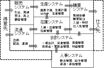 会計システムを例にします。企業活動のほとんどは、おカネの出入りを伴いますので、すべての情報システムは会計システムにつながっています。会計システムを独立なシステムとすると,すべての会計伝票を手作業で入力することになりますが,これは非常に面倒です誤りが発生する危険もあります。販売システムでの売上データは会計システムでの売掛金の勘定項目のデータになるし,購買システムでの仕入データは買掛金勘定になるのですから,それらで得られた会計に関するデータのファイルを会計システムが読み込んで処理するほうが全体として効率的です。このように、個々のシステムは、単独に存在するのではなく、互いに連動して、全社システムを構成しているのです。