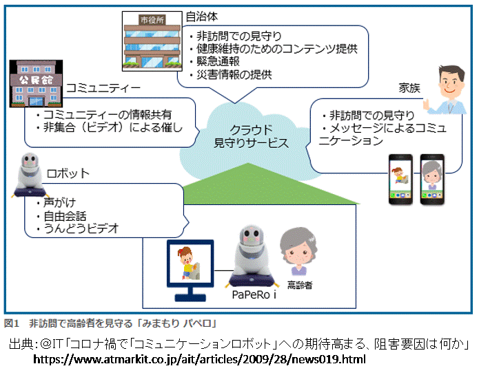 下図は「高齢者見守りシステム」でのコミュニケーションロボットの位置づけです。家庭内でのロボットをクラウド端末とすることにより、多様なサービスを実現する可能性があります。