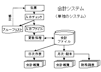 - 手作業の場合には、多様な帳簿への転記・計算が行われます。それが非効率なのでシステム化するのでしょうが、反面、その過程において第三者によりデータの誤りが発見され、その影響が局所的な時点で修正することができます。