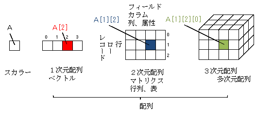 スカラー、配列(1次元配列、2次元配列、・・・)の関係を図示すると下図のようになります。