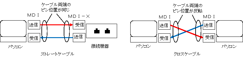 パソコンに、MDIとMDI-Xの二つのコネクタを設置するよりも、ケーブルのA端が送信ならB端を受信に、A端が受信ならB端を送信にピンの位置を逆にしたケーブルにしたほうが便利です。このようなケーブルがクロスケーブルです。