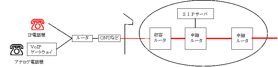 (注)ここではインターネットとしましたが、正確にはキャリアやISPが設置したVoIP基盤網(後述)です。他のインターネットとは隔離したネットワークですが、不特定の加入者が共同で利用するネットワーク形態であり、基本的なプロトコルがTCP/IPであることから、インターネットと表現しました。
