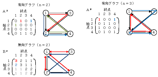 隣接行列をn乗すると,要素(i,j) の値がノードiからノードjまでのエッジ数になります。