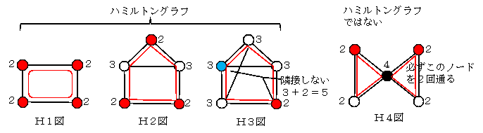 一見して、H1~H3図は赤線のように巡回できるのでハミルトングラフであり、、H4図は中央の黒ノートを左右から通るのでハミルトングラフではないことは自明であろう。