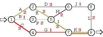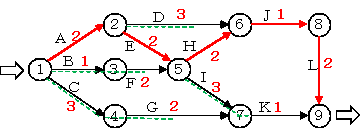 赤線が最短日数で9日間になる。この赤線にあるエッジ(作業)に余裕がなく遅れると作業終了日数に影響し、クリティカルパスという。他の作業は緑点線になり余裕がある。