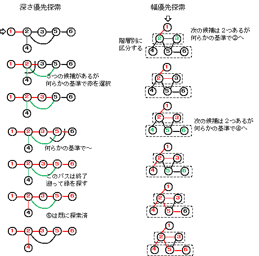 実際の探索手順は、ループがあるし、無向・有向の違いもあり、木構造での探索と比べてかなり複雑です。ここでは理論的な説明は省略して、イメージだけを示します。