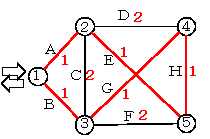 - グラフのエッジは水管であり、赤数字は水管の最大流水量能力である。ノード1の水源からノード9の流出口に水を流すとき、最大量の水流はどのようになるか。ただし、ある水管に流れる水量は、それより前の水管能力の合計を超えることはできないものとする。