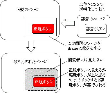 「クリック個所を乗っ取る」意味です。悪意者は、信頼のあるWebページのボタン等(バナー、リンク先なども)の部分に、悪意のあるボタン等を透明にして上乗せします。利用者がそのページを閲覧し、正規に見えるボタン等をクリックすると、悪意の処理が実行されてしまいます。