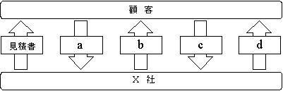 図中のa~dは,X社が顧客との取引で行う書類の受渡し手順を示したものである。時間経過を左から右としたとき,bに該当する書類はどれか。ここで,a~dはア~エのどれかに対応する。